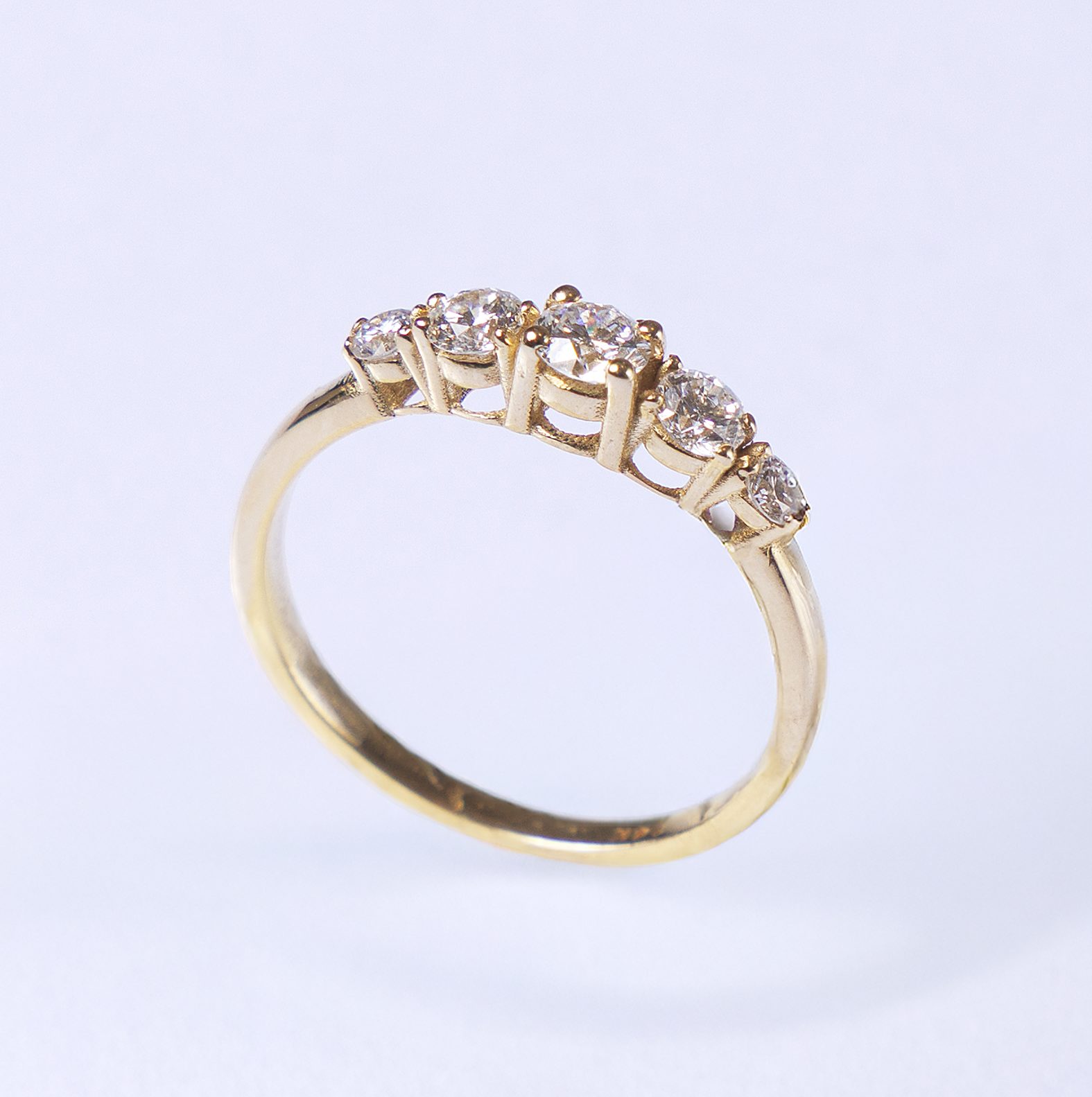 טבעת זהב עדינה עם יהלומים עגולים בגדלים שונים